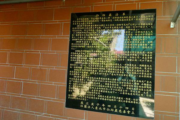 民國35年信眾建廟於山巔,上憑懸崖,下臨平野,登山步道數百級,砌以青石,直達禪院,憑殿俯視,則台北盆地盡在眼底,蔚為壯觀,地近台北,假日遊人眾多,仙跡巖主祀孚佑帝君,據說孚佑帝君在民間信仰被奉為八仙之一,俗稱呂祖或仙公。