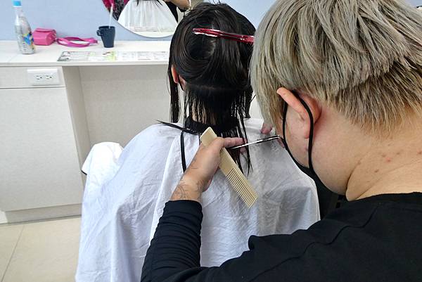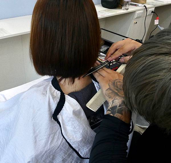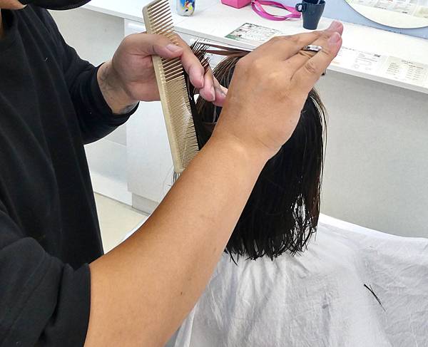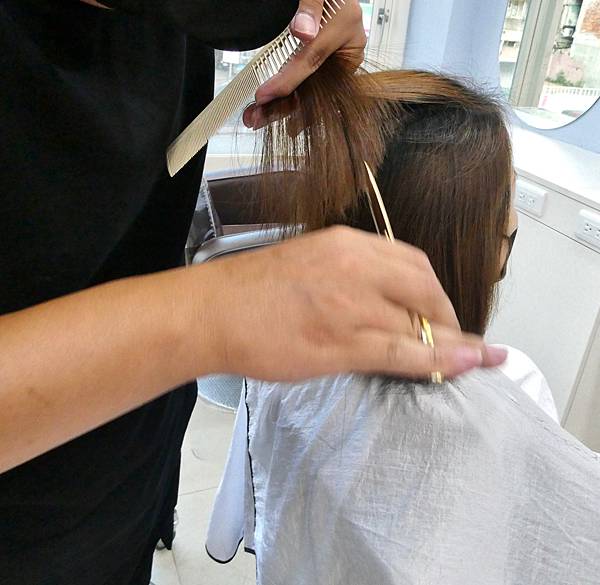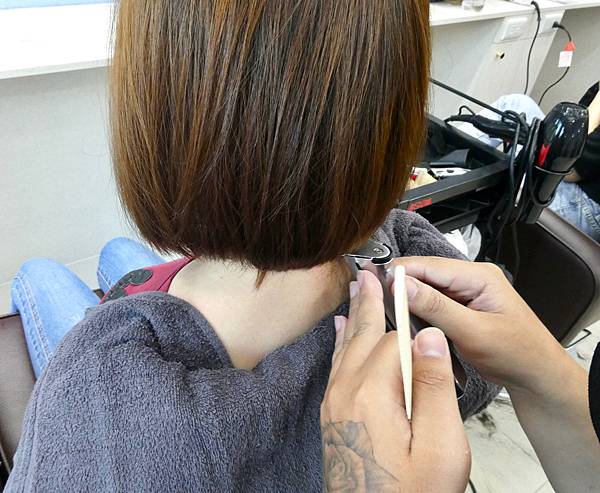 在修後面的薄厚度時,HANK說因為妹妹是細軟髮質,所以不能修太薄,要讓後面頭髮有厚度才好看。