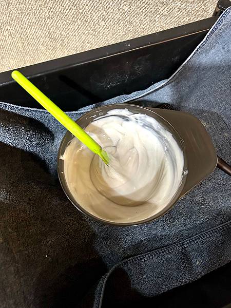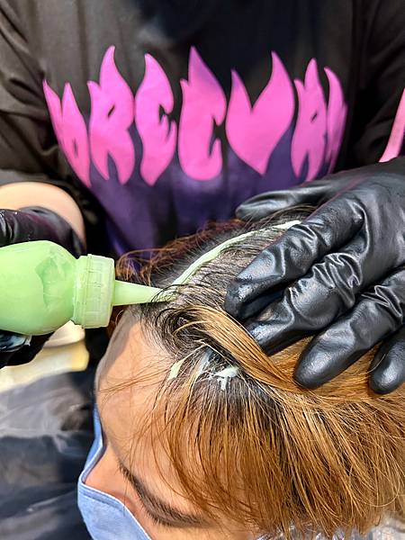 最後沖洗掉護髮素,沖洗掉過程發現頭髮顏色不對,又立馬用最不傷髮的方式,做濕染的動作。