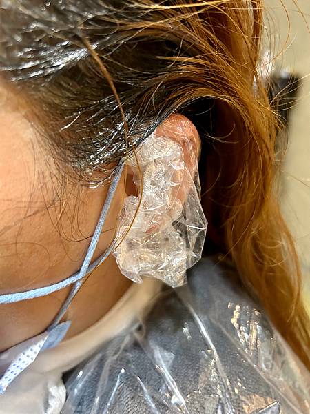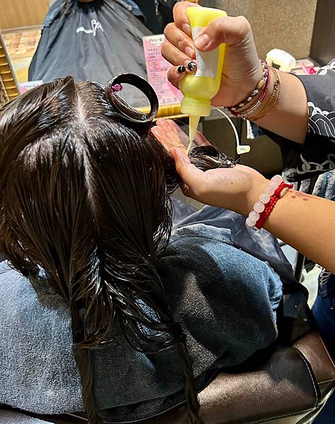 設計師先幫姐妹的頭皮做染前隔離,可以防止染劑進入頭皮傷害頭皮。