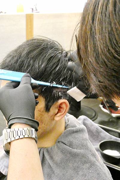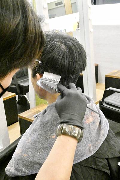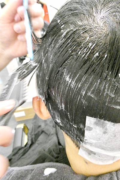 開始燙髮,因為他的髮質跟我不同,我的髮質有健康髮跟受損髮,但他只有健康髮,所以阿丹設計師拿出健康髮專用的燙髮膏。