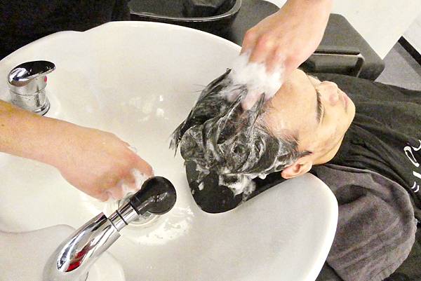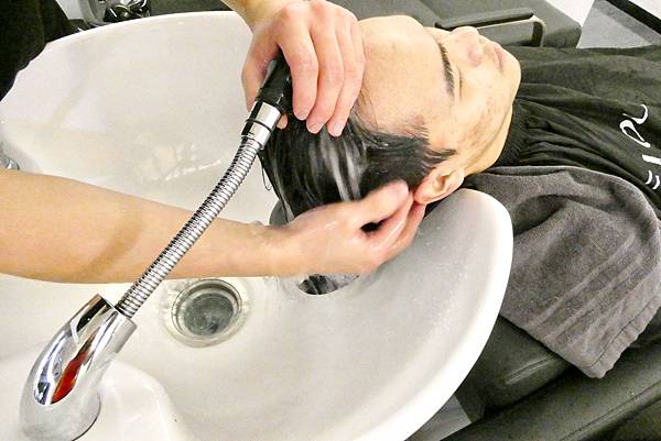 先沖掉燙膏,阿丹設計師洗頭髮使用的是燙髮專用的去鹼洗髮精,最後洗頭,很細心的洗兩次。
