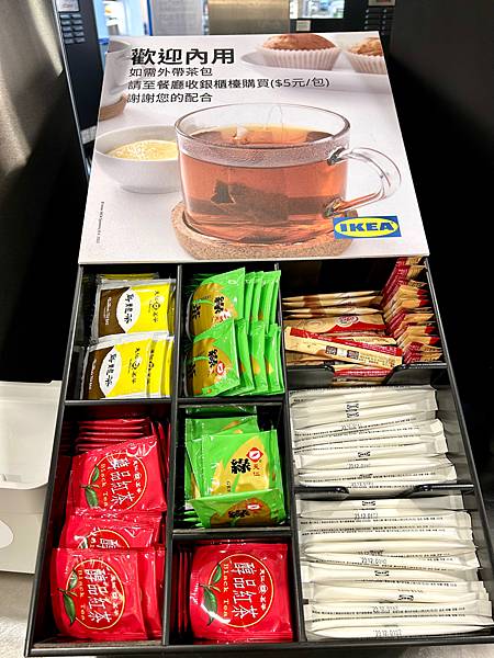 還有茶包可以加入熱水,有紅茶包、綠茶包、烏龍茶包。
