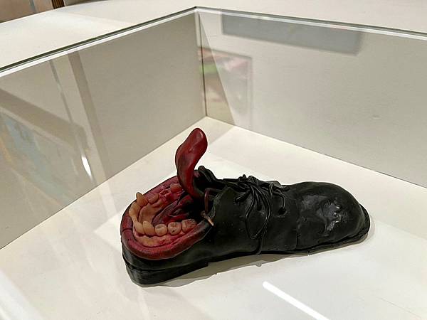 這一雙鞋子也是,你們覺得這兩雙鞋子連在一起,一個往左一個往右,怎麼走路呢?是不是感覺不知要往哪裡走,80年代就是給人有這樣的想法,80年那個時候就是有這樣的感受,你們來到臺北市立美術館來一起感受狂80的魅力吧!