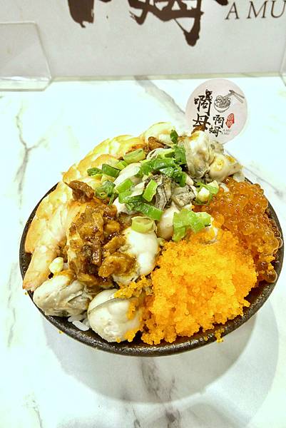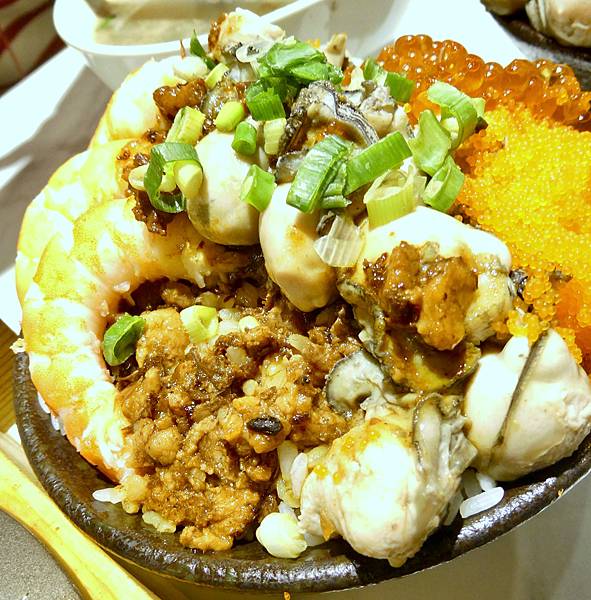 嗶嗶波波海鮮肉燥飯,鮮蝦很大,很鮮,蚵仔超大,很甜美,鮭魚卵,很鮮美,蝦卵,有點鹹,但很好吃。