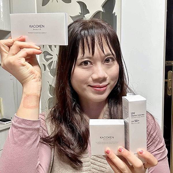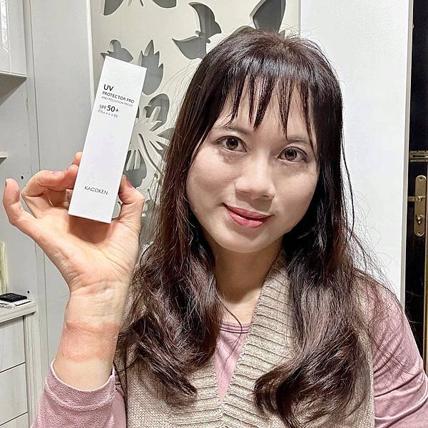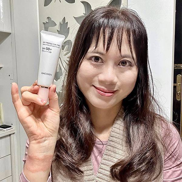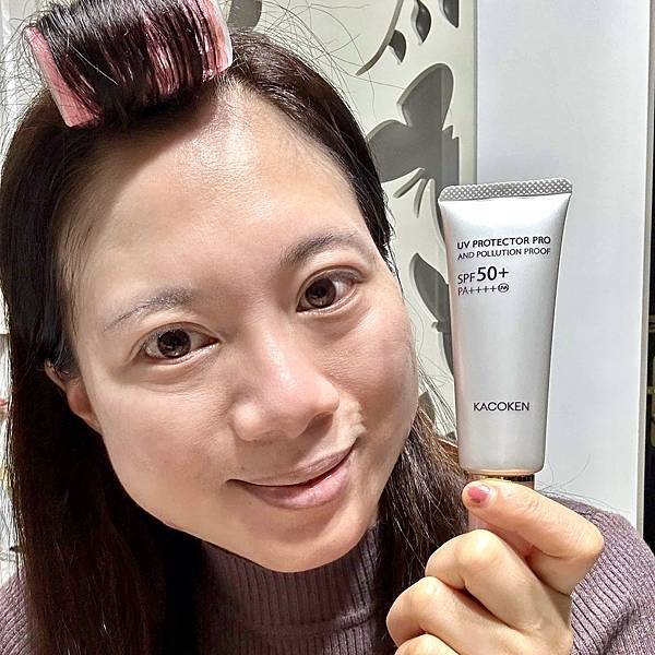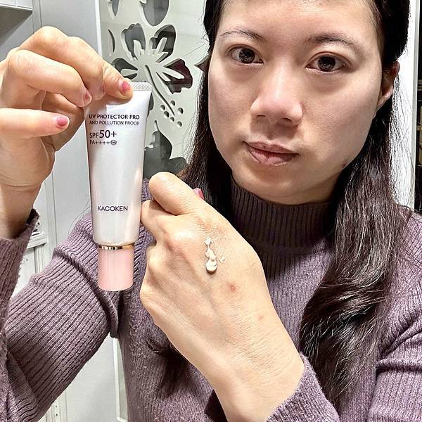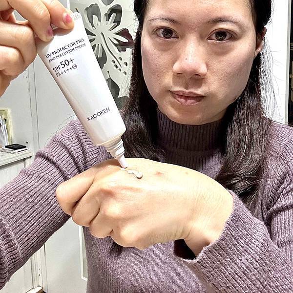 素顏,上完基礎保養,使用kacoken御姬研積極抗老防曬光采霜SPF50+。