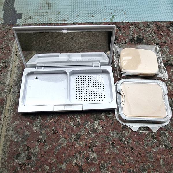 粉餅使用在底妝,濕用,將海綿浸濕,輕扭乾水分,然後塗上粉餅。