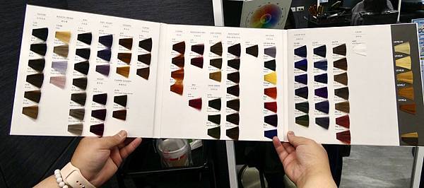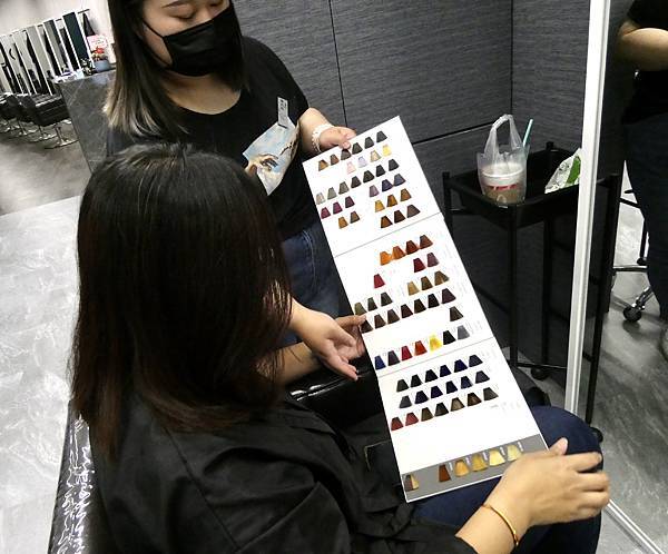 閨蜜一坐下來,店長就很貼心的拿出色卡,先讓閨蜜參考,因為閨蜜不想挑染,所以她希望是染髮色基本色,不挑染。