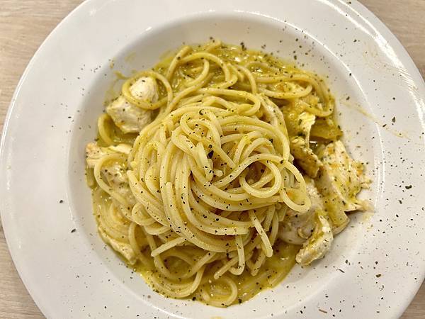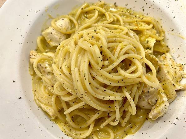 這盤義大利麵我很推薦誒,雞肉是用舒肥雞瘦肉,但肉不柴,很好吃,南瓜搭配黑胡椒,超香的很好吃,肉很大塊,我跟我媽分著吃,我們推薦草泥CAFE的義大利麵。