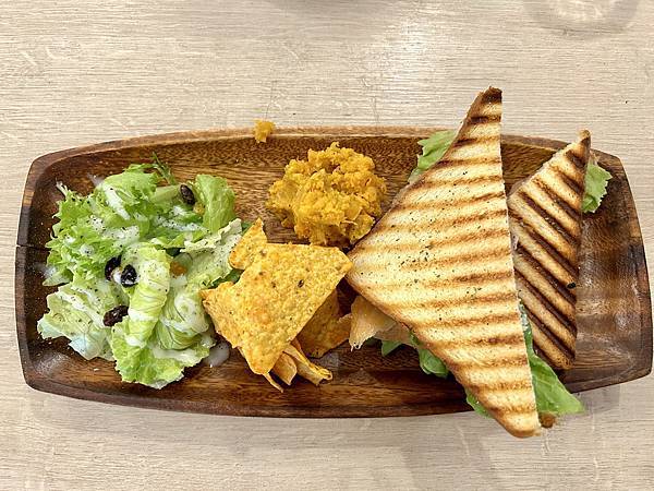 有玉米片餅跟可以搭配旁邊的南瓜泥,玉米片搭配南瓜泥可以中和玉米片的鹹味,玉米片單吃也很好吃,這樣的餅乾有點像在吃多力多滋,南瓜泥南瓜新鮮,口感有顆粒吃得到南瓜,旁邊的沙拉,有果乾,醬是有點像優格口感,微甜好吃,煙燻鮭魚熱壓吐司,很好吃,裡面有蔬菜還有煙燻鮭魚,還有起司,口感很有層次。