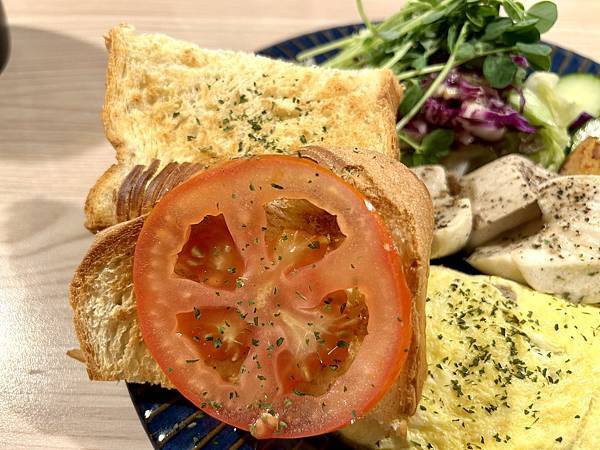 早午餐裡有一片番茄,番茄是整片的,還有兩塊麵包,麵包烤得剛剛好酥脆。