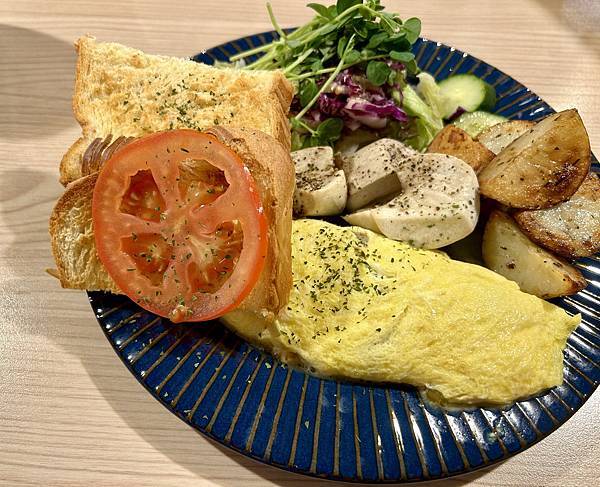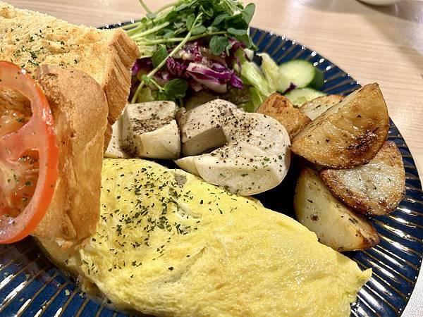 鮪魚歐姆蛋,雖然裡面的鮪魚是罐頭的,但是搭配coffeee咖啡早午餐的自製歐姆蛋,他的歐姆蛋真的很厲害,入口即化,滑嫩順口,再加上鮪魚的口感,超好吃,生菜沙拉菜也很鮮甜,還有杏包菇多汁夠厚,還有濃濃的黑胡椒,烤馬鈴薯,烤的很剛好,多汁的馬鈴薯還有蔬菜,份量也剛剛好,很好吃。