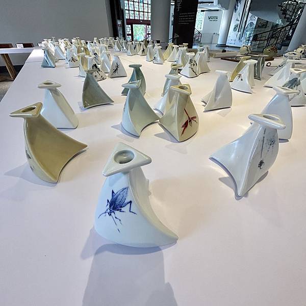 林文嶽藝術家,很喜歡在陶器上彩繪,燒製完成後就彩繪一些『活』的生物與荷花,陶器作品真的都很美,彩繪也很美,上面可以看到很多昆蟲呀!荷花之類的,還有魚。