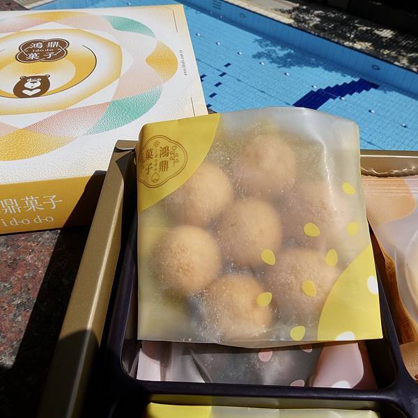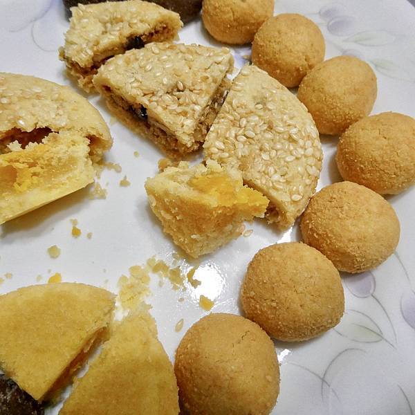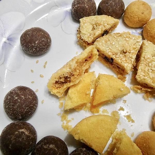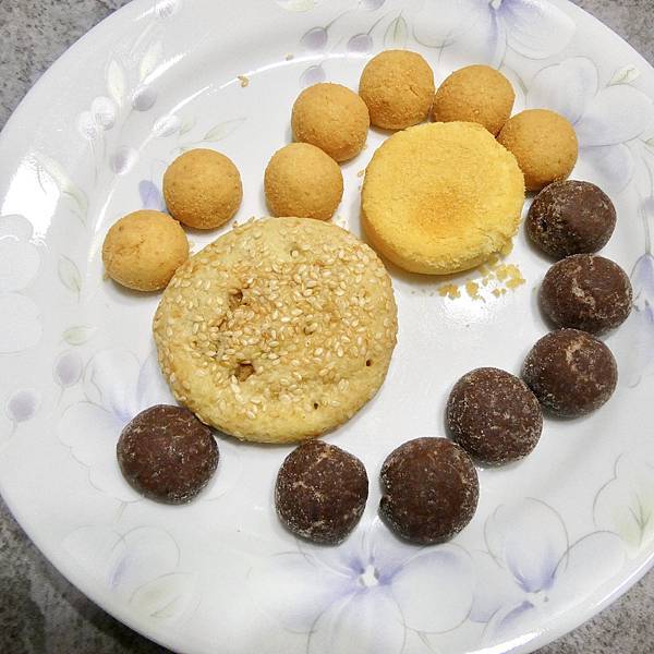 裡面的伴手禮中西合併的小點心,討喜酥白芝麻原味1個、討喜酥亞麻籽鹹蛋黃1個、法式黑巧克力雪球1個、法式起司雪球1個、鳳凰酥4個。