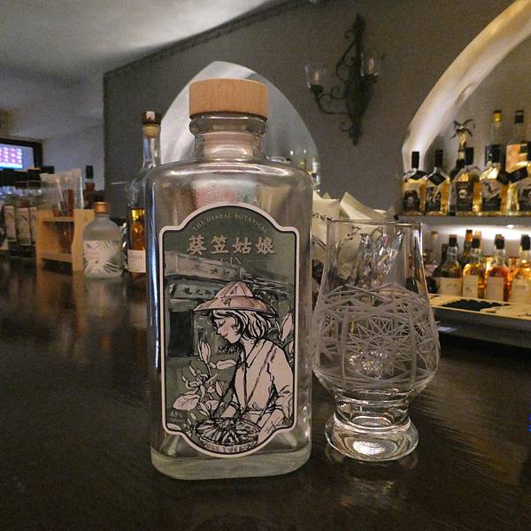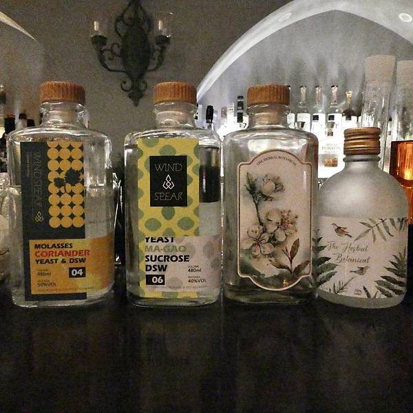 在等我們的調酒之前,我們還發現了這間酒吧有台灣自己產的酒,這間酒吧是跟台東訂酒,順便推廣台灣的酒。這兩支都是台灣的酒,老闆還有讓我們試喝,下面一支是利用原住民的刺蔥,酒名是『鳥不踏』,上面那支利用用玉蘭花,偏水蜜桃與葡萄的香氣葵笠姑娘。