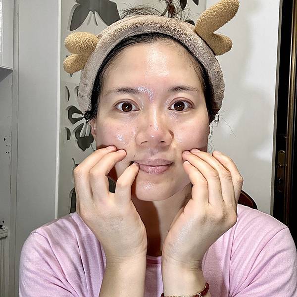 按壓出適量,我的用量大概連脖子五下左右,先均勻塗抹於臉上脖子上,再輕輕按摩全臉及頸部,如有需要加強的地方可以多按摩幾下,他除了保濕鎖水之外,還可以撫紋,脖子常常會忽略,脖子最顯老的地方,更需要多加按摩。