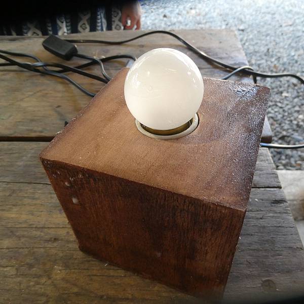 先挑選自己喜歡的木頭,然後先刷乾淨、再去鑽洞、磨平、鑽孔、組合燈座跟電線、放入燈座鎖上燈泡、木頭上保護漆,測試燈泡是否會亮,完成。
