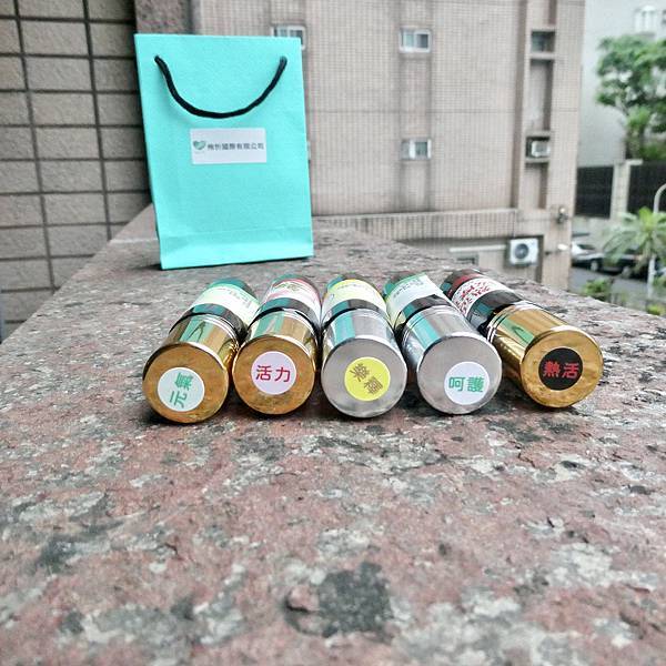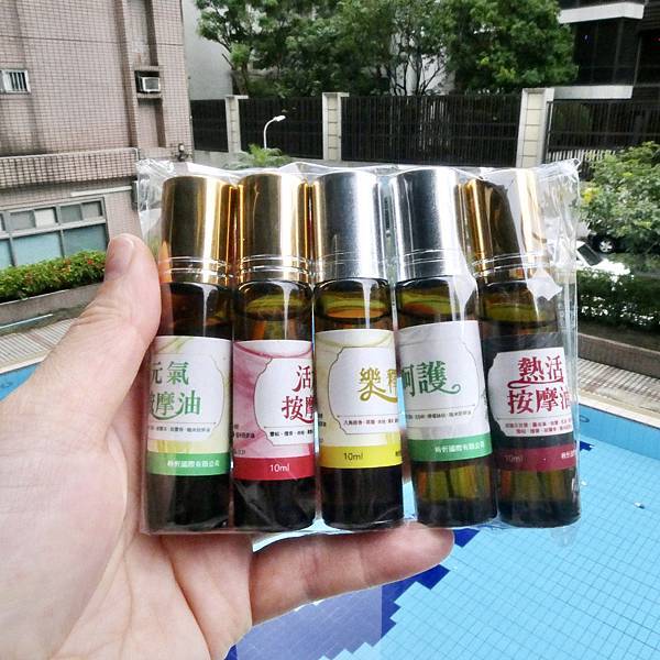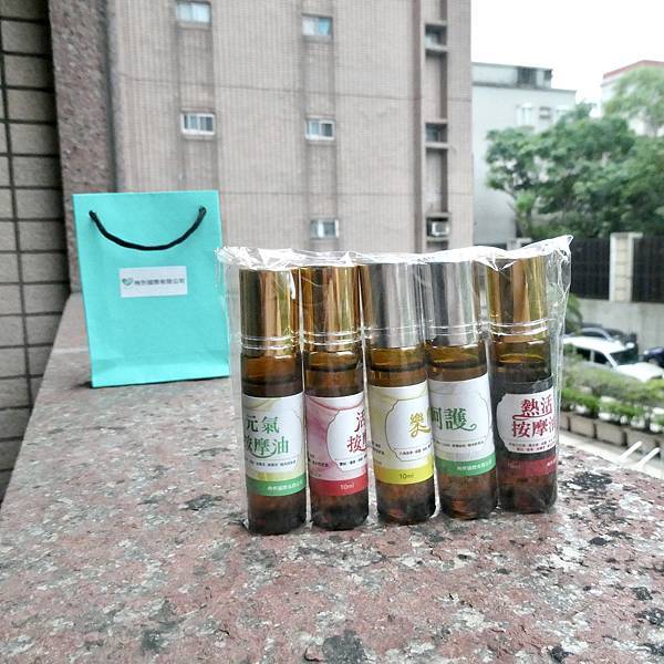 裡面有五支10ml的複方按摩滾珠精油,包含元氣\活力\樂釋\呵護\熱活按摩油。
