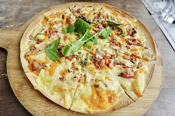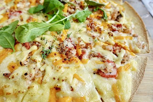 明太子海鮮薄餅,明太子新鮮好吃,有海的味道,搭配超濃起司,還有奶味十足的披薩,薄片披薩餅皮薄而酥,口感很有層次,超好吃,這個口味的披薩口感獨特,海的風味十足,我喜歡這樣的口味。