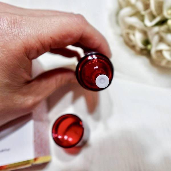 這一瓶精華,包裝設計很特別,我覺得很漂亮,紅色超有質感,而且用按壓方式的,下面有蓋子。