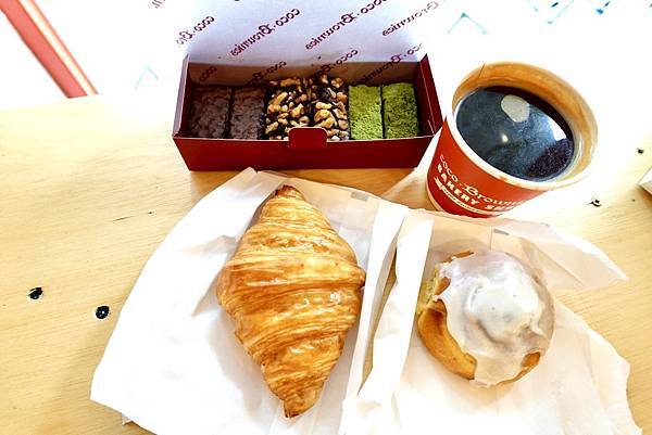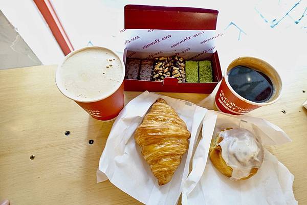 坐下後,我就去點我跟朋友的下午茶,我點了兩杯咖啡跟兩個麵包,還有三入禮盒裝的布朗尼,我真心推薦要吃布朗尼跟原味可頌,真的超好吃。