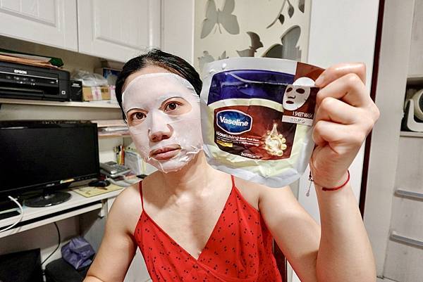 如何敷vaseline面膜呢?我會選擇在生理期期間敷面膜,還有在週間做週期保養,早、晚卸妝洗臉後,取出vaseline面膜,我會先揉搓面膜包裝,讓面膜紙完全吸收精華液,再拆開面膜包裝,取出面膜,對準眼、口、鼻敷上肌膚,這片vaseline面膜的面膜紙很不錯,屬於厚的,很服貼,不容易破,敷上肌膚的時候還可以感受到精華液被吸收,感受緊緻。