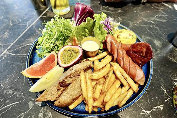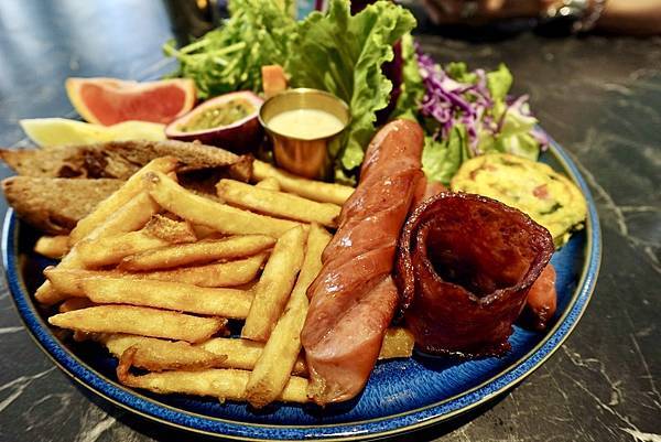 這一盤就超美式,薯條很好吃,不油膩,不鹹,很脆,一口接一口吃不停,搭配解膩的生菜,生菜真的超好吃,很甜,我都吃原味,德式香腸,我們三人分著吃,都覺得老闆處理香腸處理得很好,香腸肉不乾、不硬多汁,還有培根片,不柴,好吃,搭配雜糧麵包,這個雜糧麵包有老闆的獨特配方,讓麵包烤後不乾,又香又軟很好吃,後來閨蜜就去問老闆有沒有單點麵包,老闆說沒有,但又幫我們多烤三塊給我們吃,真心推薦麵包跟薯條一定要吃吃看,這個大餐盤推薦。