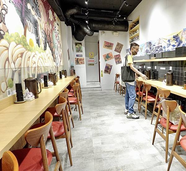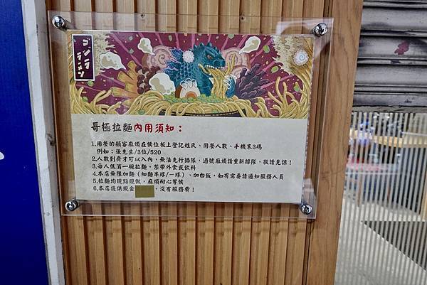 到了哥極拉麵本店,一進店裡,發現空間規劃還不錯,座位是橫式的座位,兩排,一排靠近廚房,一排靠近牆邊,如果一人去吃也剛剛好,牆面上很多日式的怪獸玩具,還有畫作,點餐方式是利用QR碼點餐,哥極拉麵的菜單也需要用QR碼查看,點完餐後去櫃檯結帳,廚房就會製作料理了,如有不知怎麼點也可以邊點邊問。