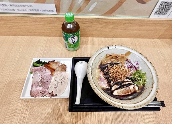 黑蒜,濃厚豚骨湯,手揉粗麵、台灣味(口味較清淡),三種叉燒拼盤+飲品,無糖綠茶(原粹)
