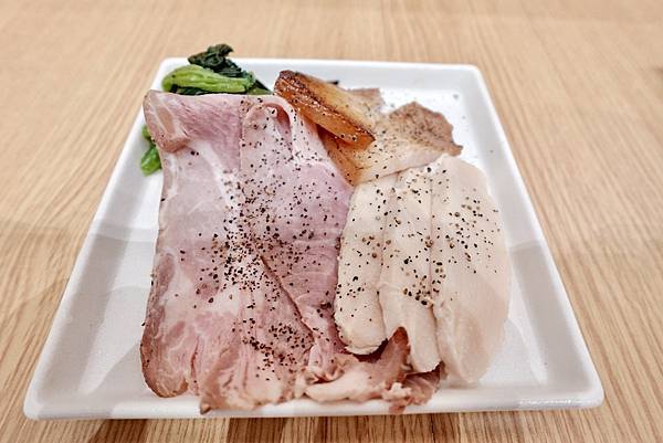 台灣味,淡淡的香氣,沒有日本鹹這麼鹹,清淡香甜的湯頭,符合台灣人口味,加上一樣舒肥雞胸肉,還加點套餐,內容有三種叉燒拼盤,第一種就是拉麵裡的叉燒肉,肥瘦適中的叉燒,偏油脂的五花叉燒,五花叉燒超好吃,鹹鹹的口感帶有一點油脂還有醬油香的入口,不油膩、不肥,味道很香濃。