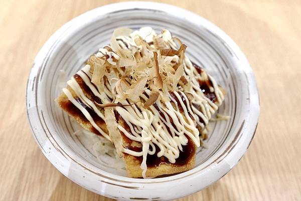 日式炸豆腐,用日式炸豬排的醬來搭配豆腐,豆腐外皮酥脆內嫩的口感,搭配鹹甜的醬汁。