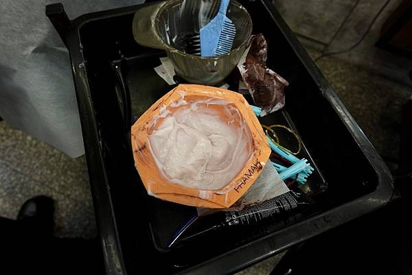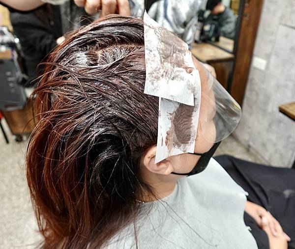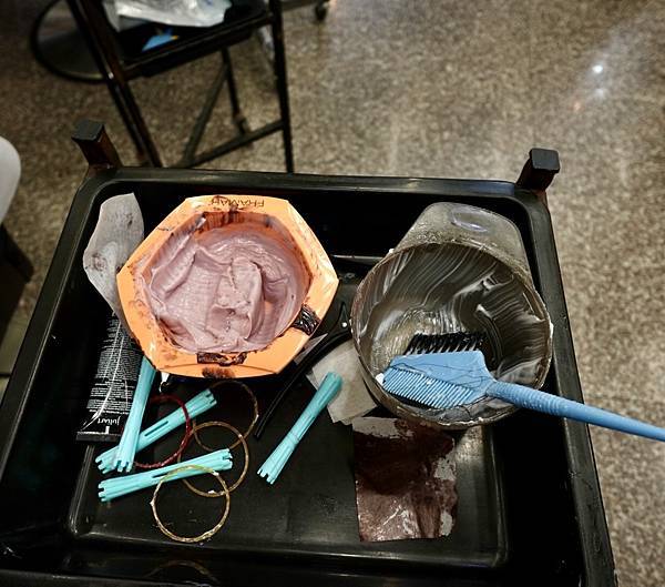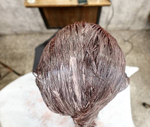 隔離後開始染髮,設計師第一步先幫閨蜜染頭頂的白髮,白髮要過色會比較久,頭頂也很久沒染了,所以有一大圈大布丁。