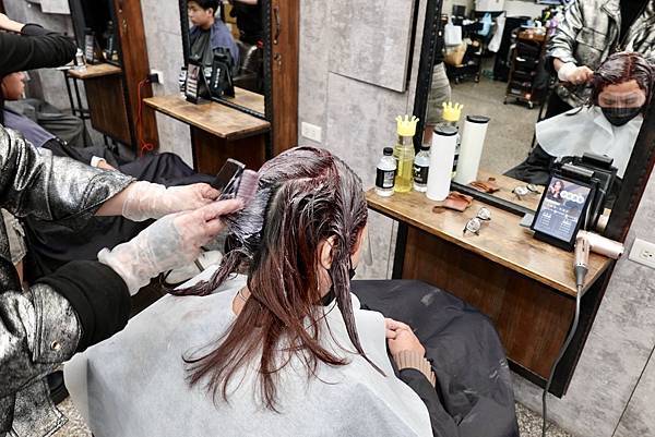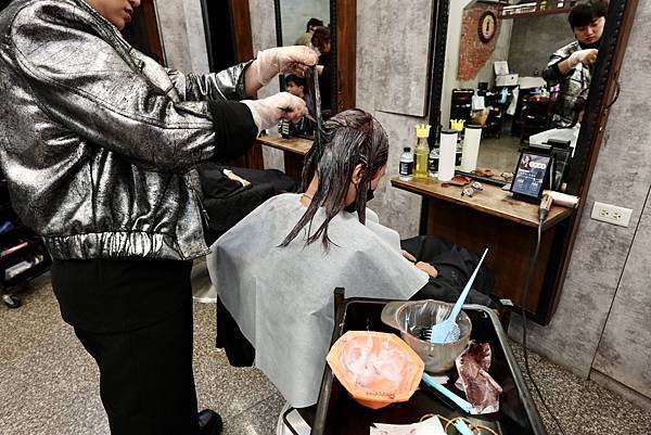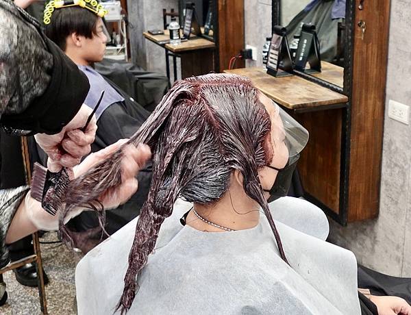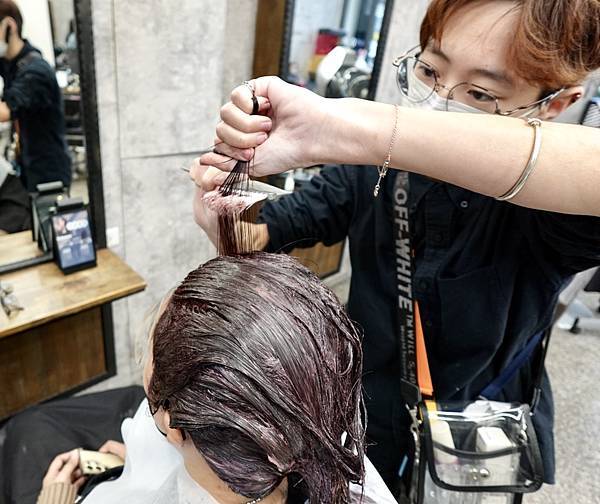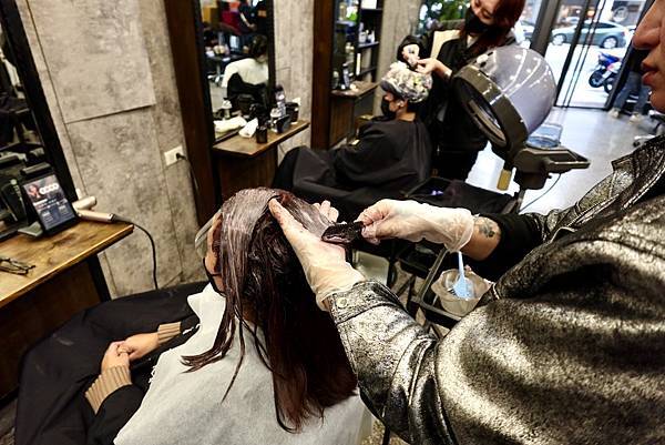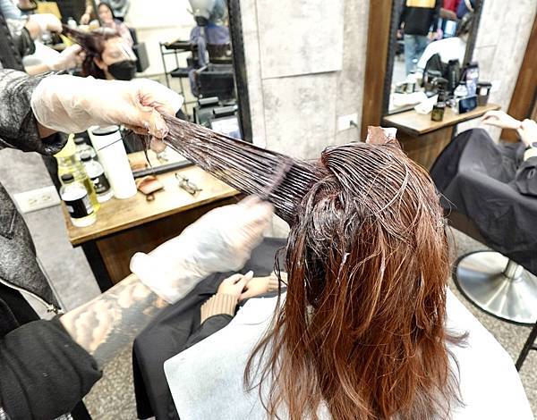 頭頂染完後,設計師幫閨蜜染其他頭髮,設計師設計三種顏色在閨蜜的頭髮上,設計師也跟閨蜜說,我這個特調是親自幫妳調色的,也不會有人的頭髮跟妳顏色一樣,只屬於妳的專屬髮色。