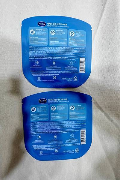 第二種是洗臉後,先使用化妝水與精華液之後,取出凡士林藍色保濕面膜,拆開後對準眼鼻嘴,敷在臉上,一樣輕輕按摩面膜讓面膜與臉部緊密貼合,等待15-20分鐘後取下面膜,依自己狀況再補充乳霜。