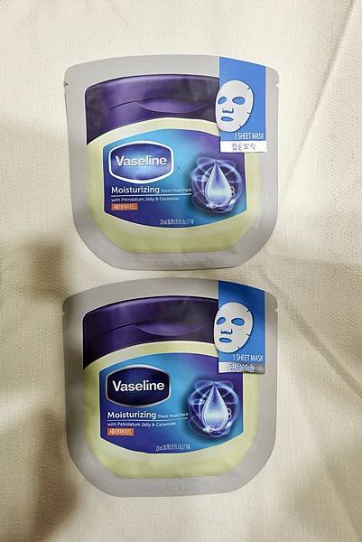 凡士林面膜的包裝很可愛,就像一片凡士林,不是一罐,包裝很可愛,藍色就是包裝是藍色的保濕面膜、綠色就是包裝是綠色的鎖水面膜、紅色就是包裝是紅色的滋養面膜,凡士林面膜推出三種。
